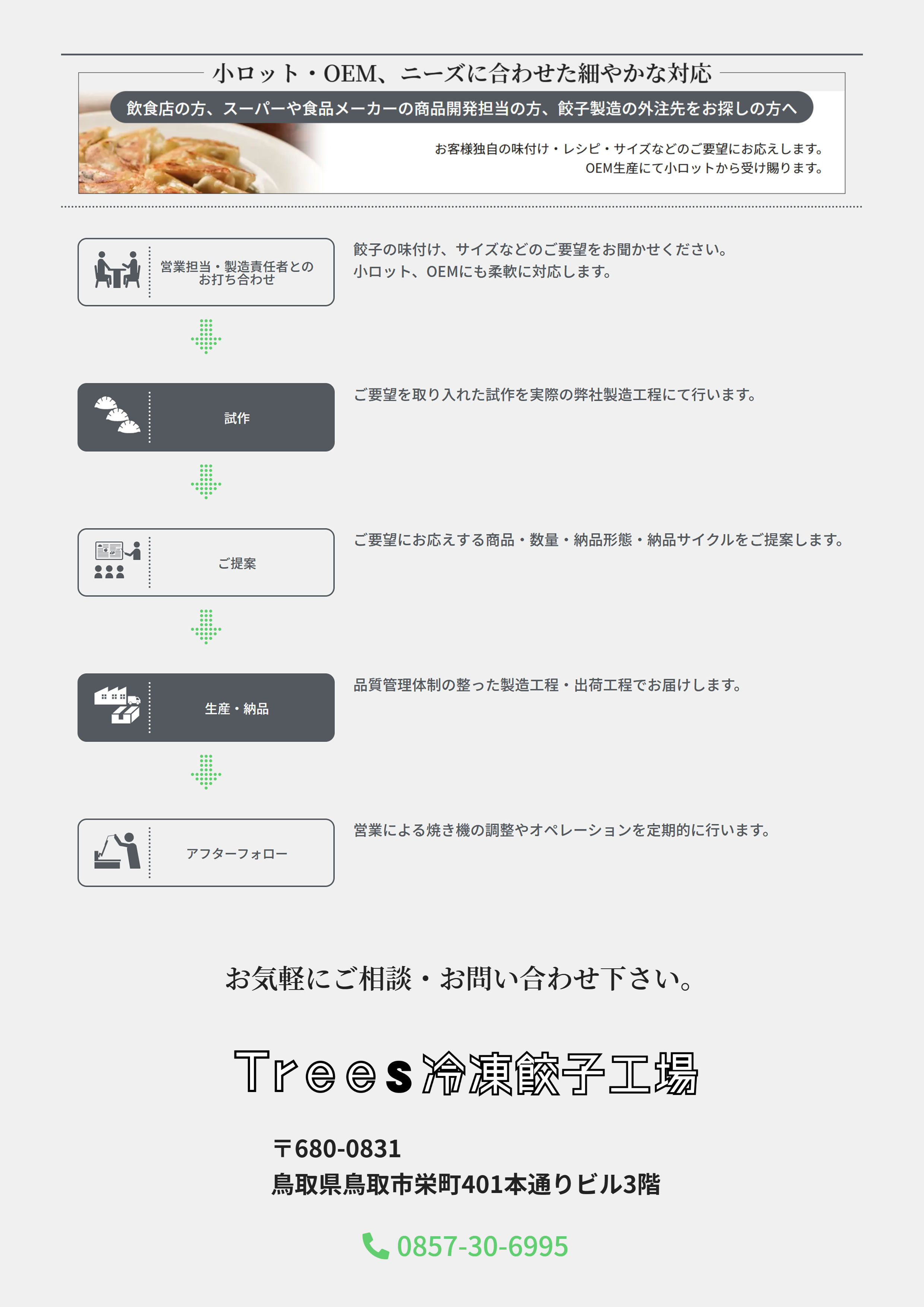 小ロット・OEM、ニーズに合わせた細やかな対応 飲食店の方、スーパーや食品メーカーの商品開発担当の方、餃子製造の外注先をお探しの方へ